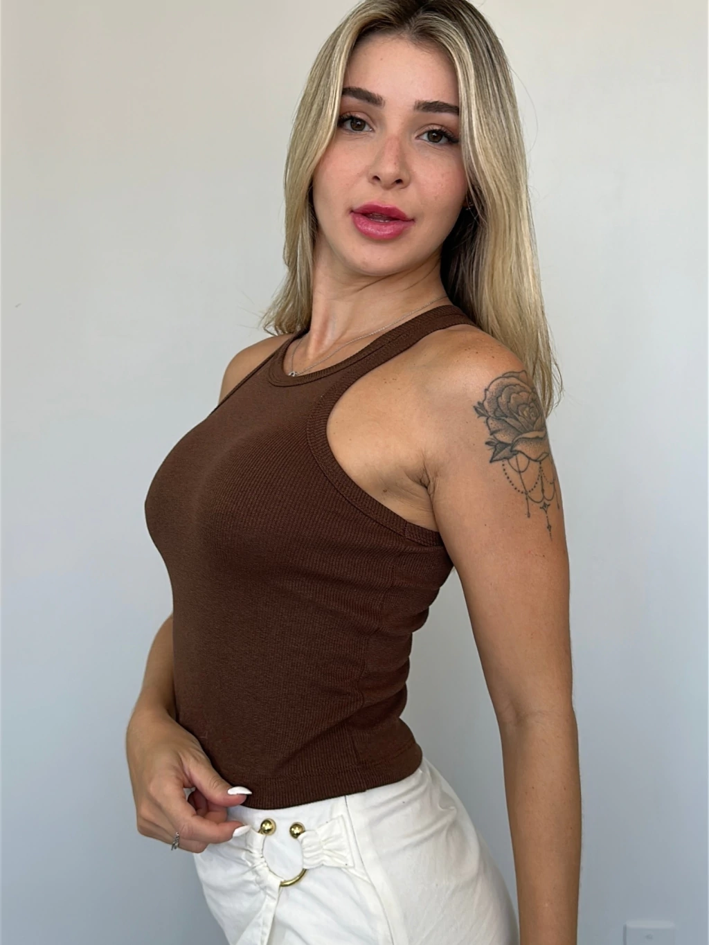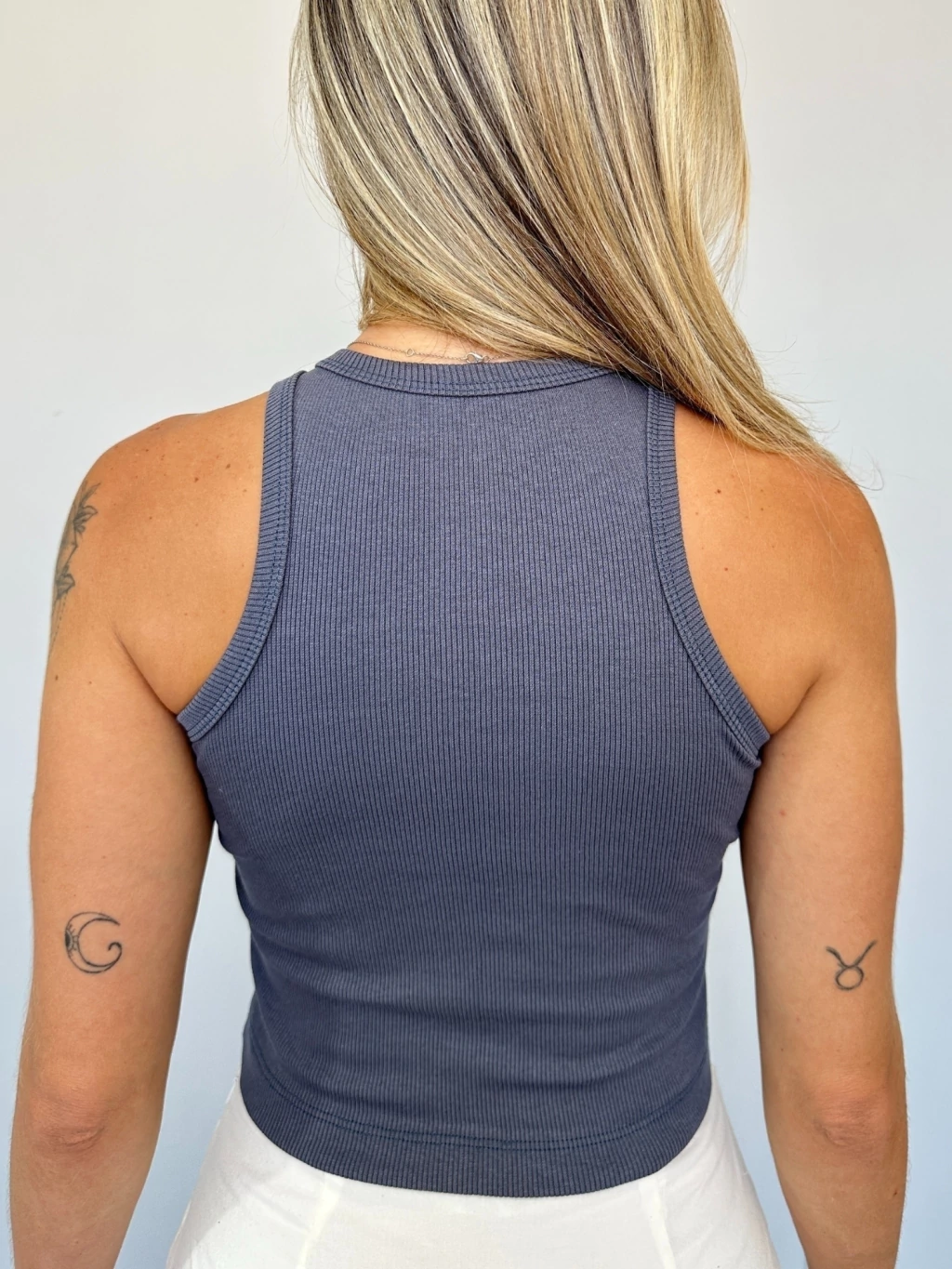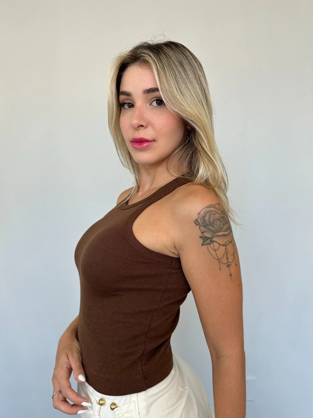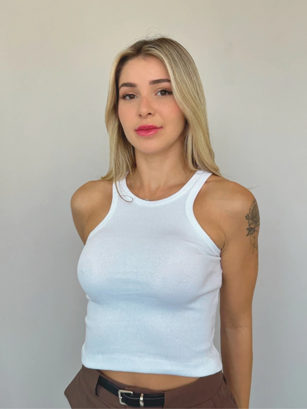 • Canelado, sem mangas, com modelagem cropped ajustada