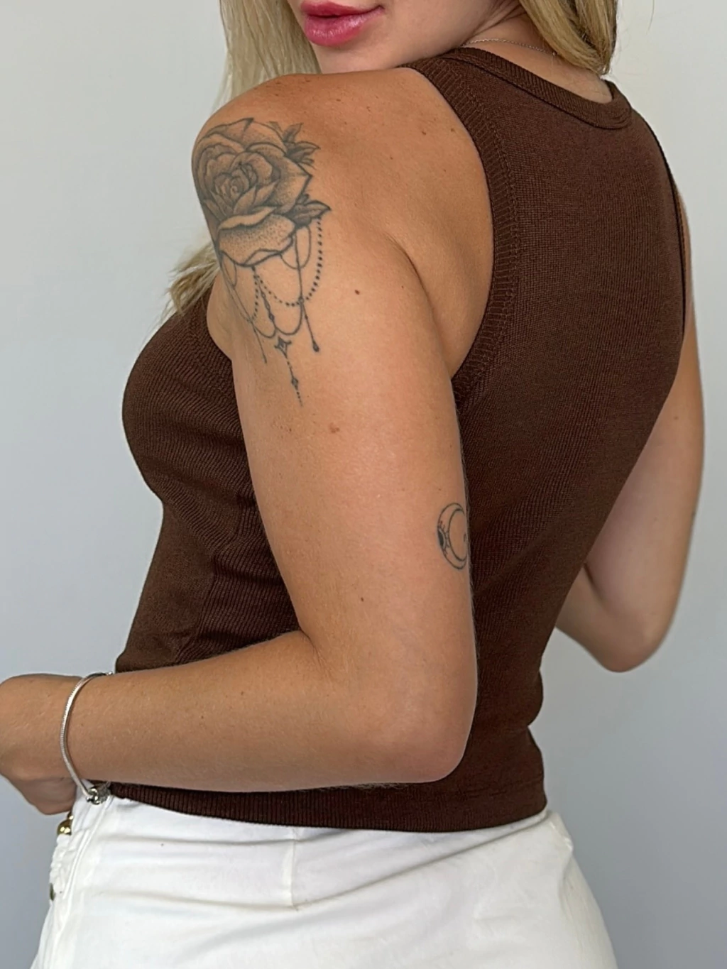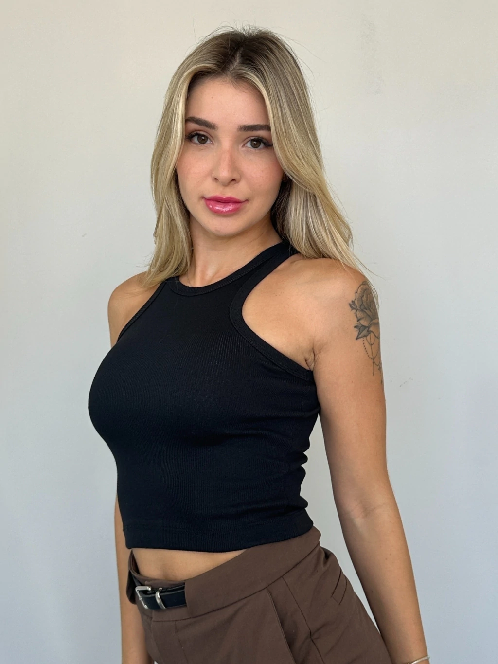 Feito em algodão, poliéster e elastano, oferece caimento perfeito, elasticidade ideal e toque macio. Use com jeans, peças de cintura alta ou no pós-treino — ele acompanha seu ritmo com estilo.