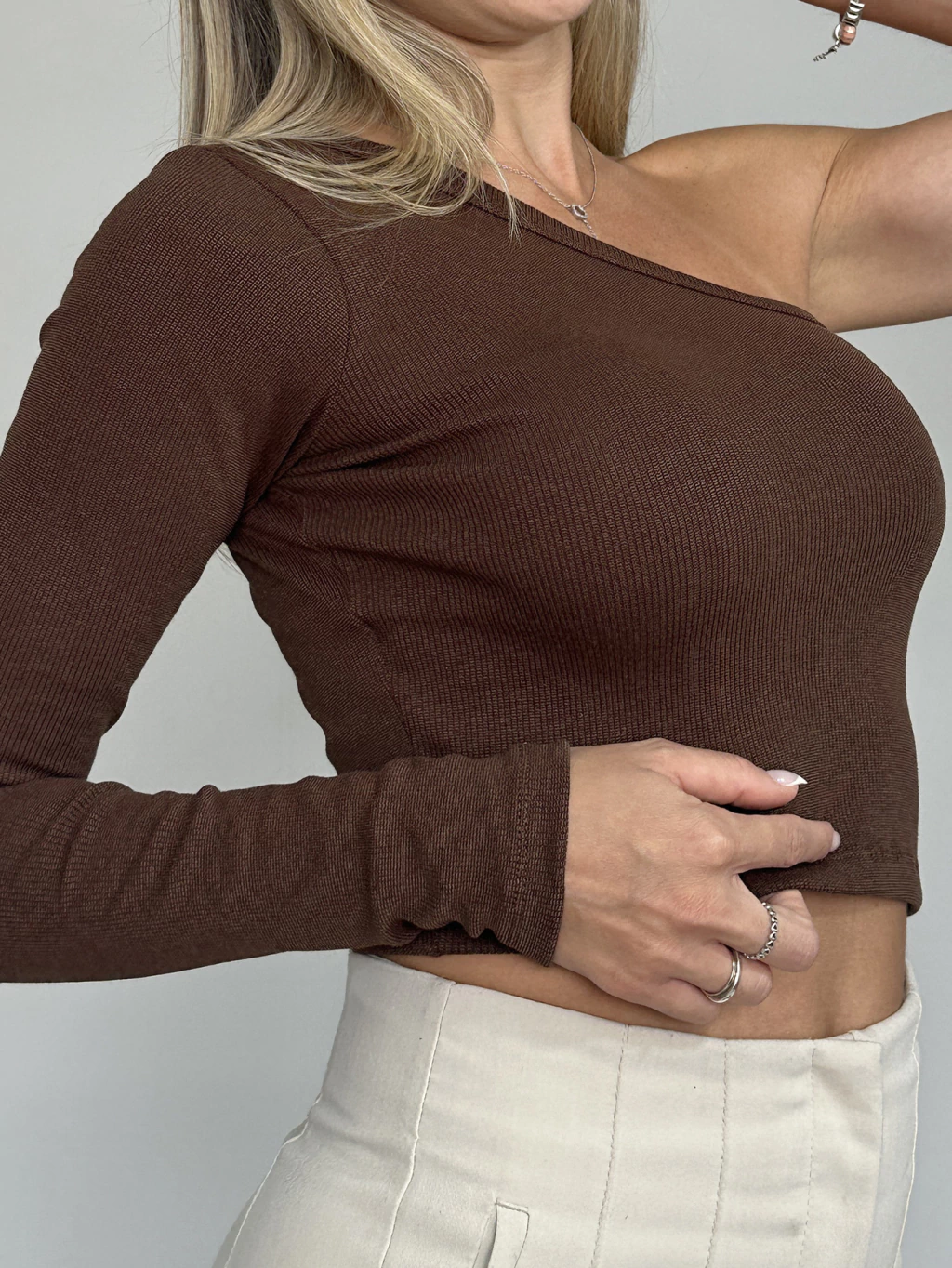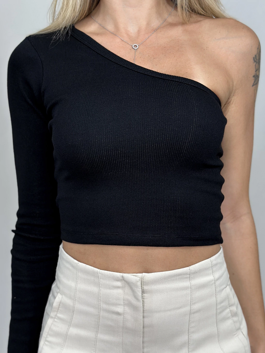 Diferente na medida certa! O Cropped Canelado Um Ombro Só foi pensado para quem quer sair do óbvio com elegância. Com design assimétrico e manga longa, ele entrega um visual moderno, sensual e superversátil.